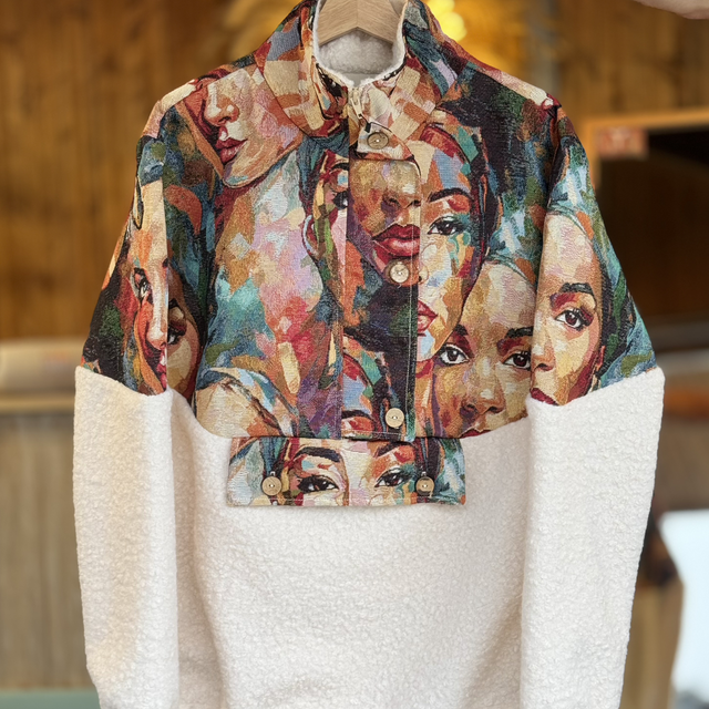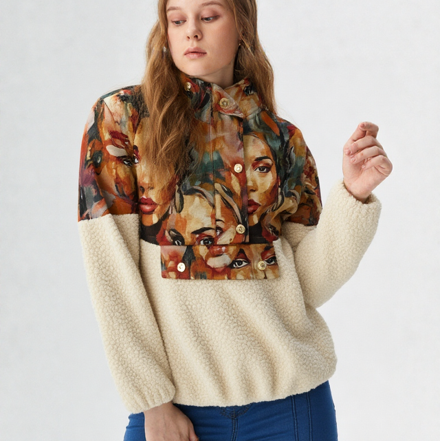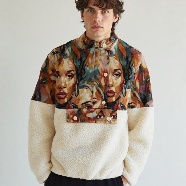 The Art Faces Unisex Jacket merges the softness of premium cotton with a woven upper panel depicting artistic human faces.